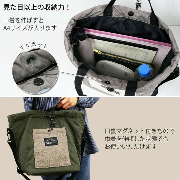 "尺寸: [身體](大約)高32cmx寬(上37cm,下22cm)x夾層16cm [肩部】(約)62-120cm [手柄](約)14cm(站立)。 [儲物] 1個主開口,2個內扣口袋,1個前開口袋,1個後拉鏈口袋 [開口] 磁扣,抽繩 [重量】(約)220克 產地: 中國 材質: 聚酯纖維 波浪被和蟒蛇材質的結合讓這款抽繩肩包變得可愛。 抽繩設計讓您可以根據自己的需要改變形狀,它還可以用作手提包。 拉繩拉開後,它的容量足以裝下一個 A4 大小的包,寬大的袋口讓它的收納能力比看上去更強! 由於袋口背面有磁鐵吸附,因此拉繩拉開後也可以使用。 內側有兩個口袋,外側有一個口袋,前後各一個。 它有足夠的儲物空間,建議日常使用。"
