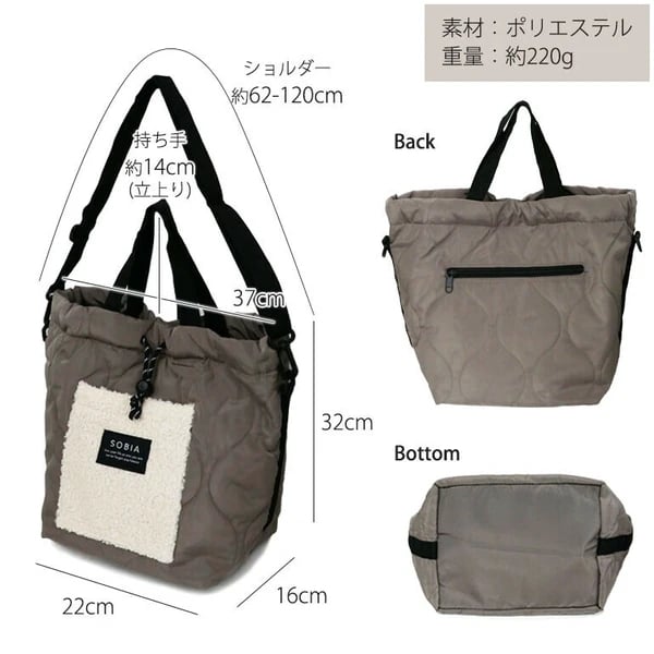 "尺寸: [身體](大約)高32cmx寬(上37cm,下22cm)x夾層16cm [肩部】(約)62-120cm [手柄](約)14cm(站立)。 [儲物] 1個主開口,2個內扣口袋,1個前開口袋,1個後拉鏈口袋 [開口] 磁扣,抽繩 [重量】(約)220克 產地: 中國 材質: 聚酯纖維 波浪被和蟒蛇材質的結合讓這款抽繩肩包變得可愛。 抽繩設計讓您可以根據自己的需要改變形狀,它還可以用作手提包。 拉繩拉開後,它的容量足以裝下一個 A4 大小的包,寬大的袋口讓它的收納能力比看上去更強! 由於袋口背面有磁鐵吸附,因此拉繩拉開後也可以使用。 內側有兩個口袋,外側有一個口袋,前後各一個。 它有足夠的儲物空間,建議日常使用。"