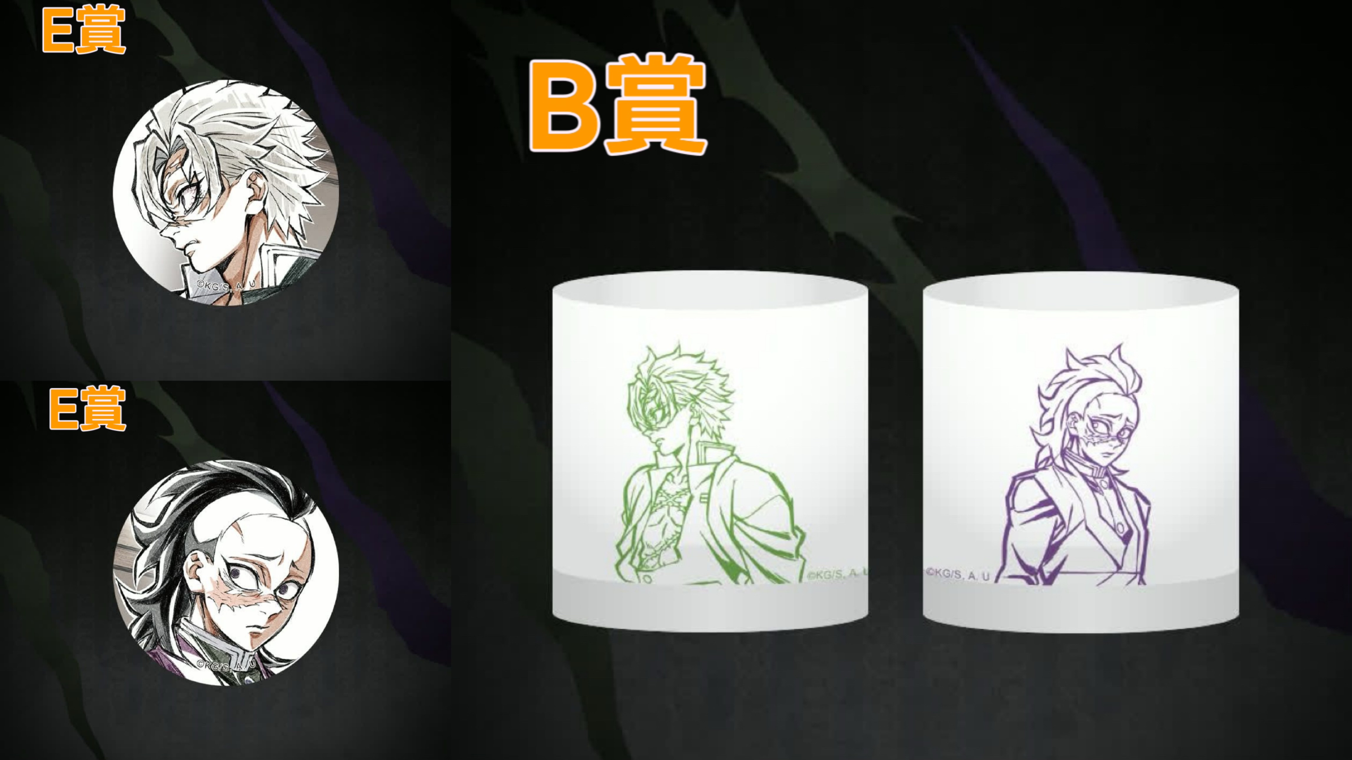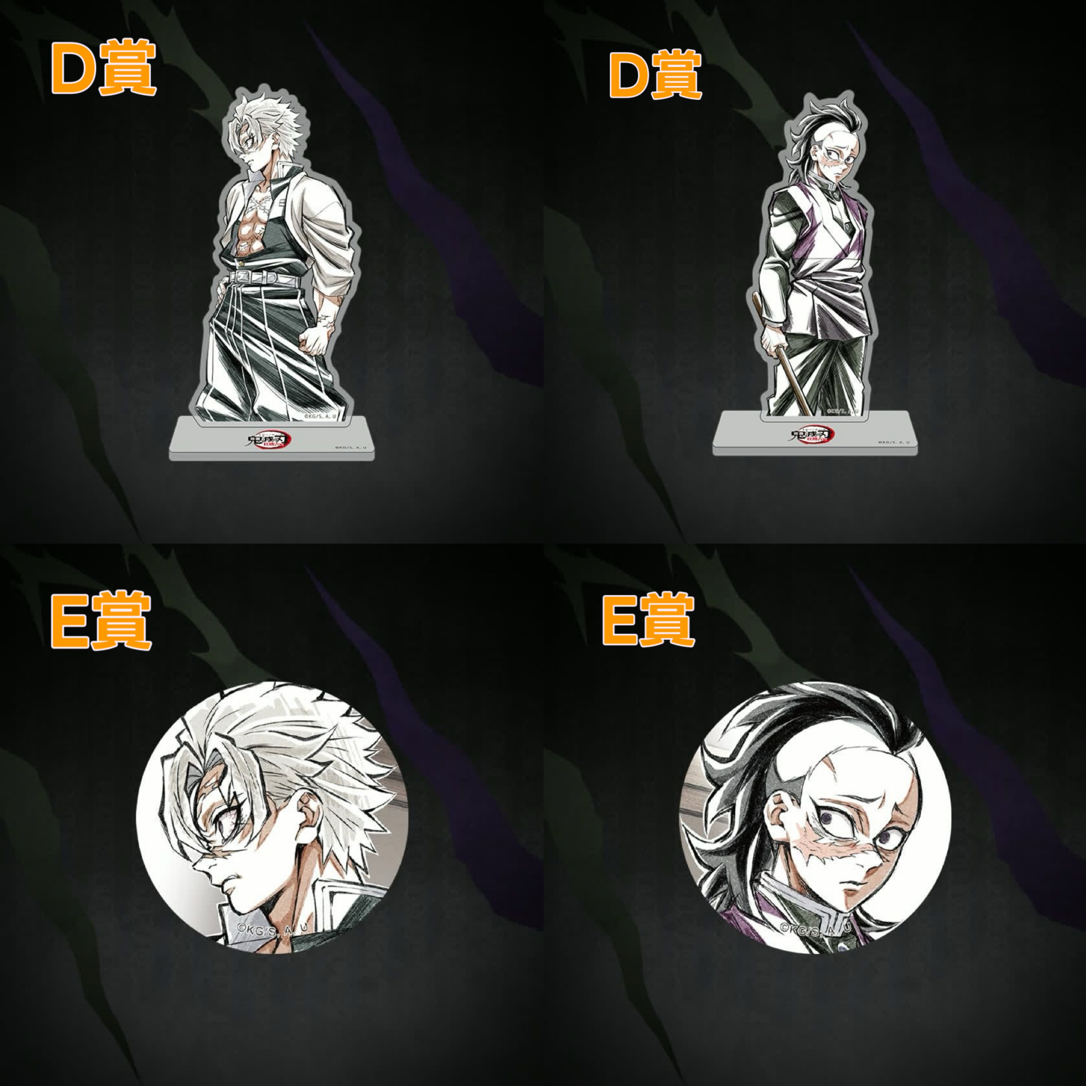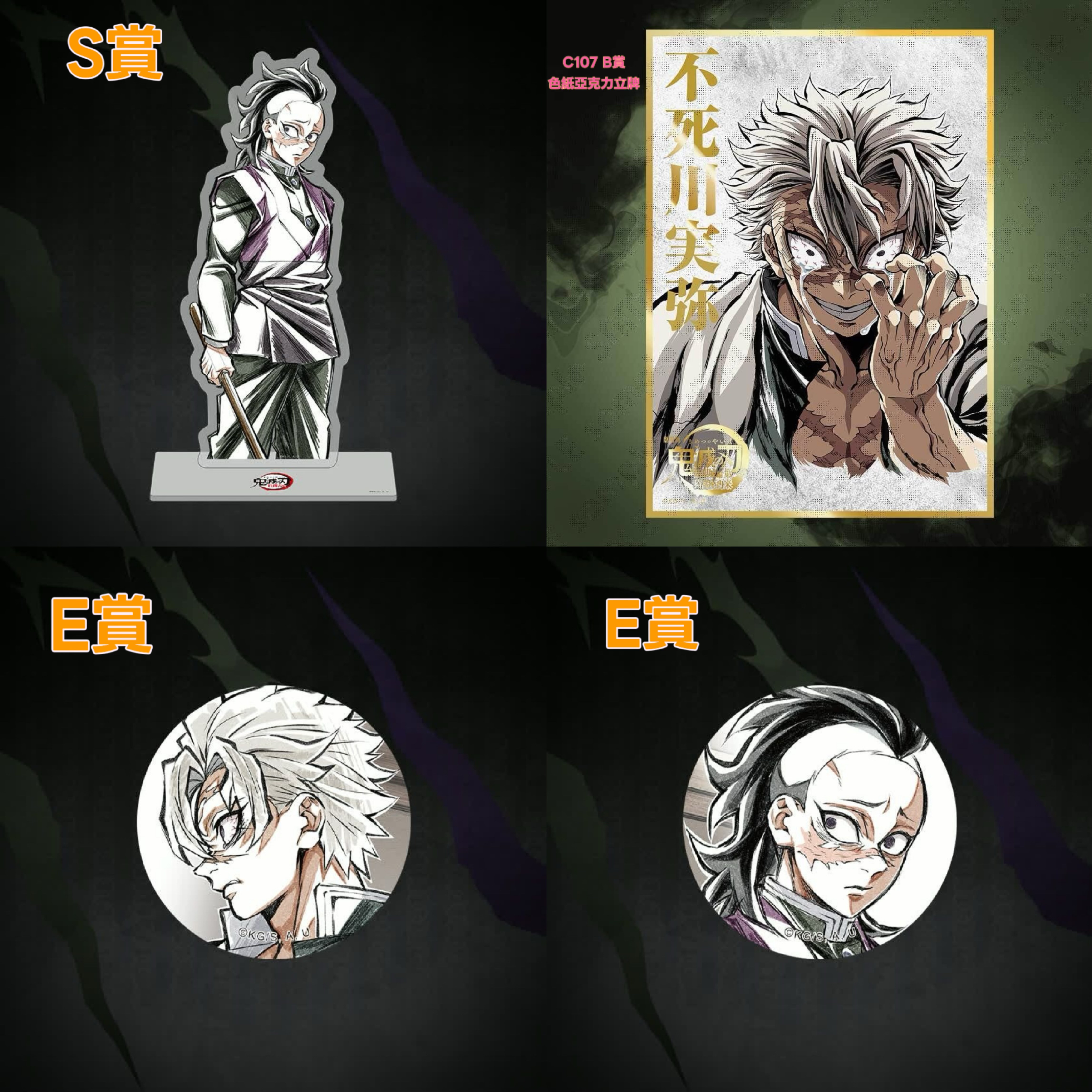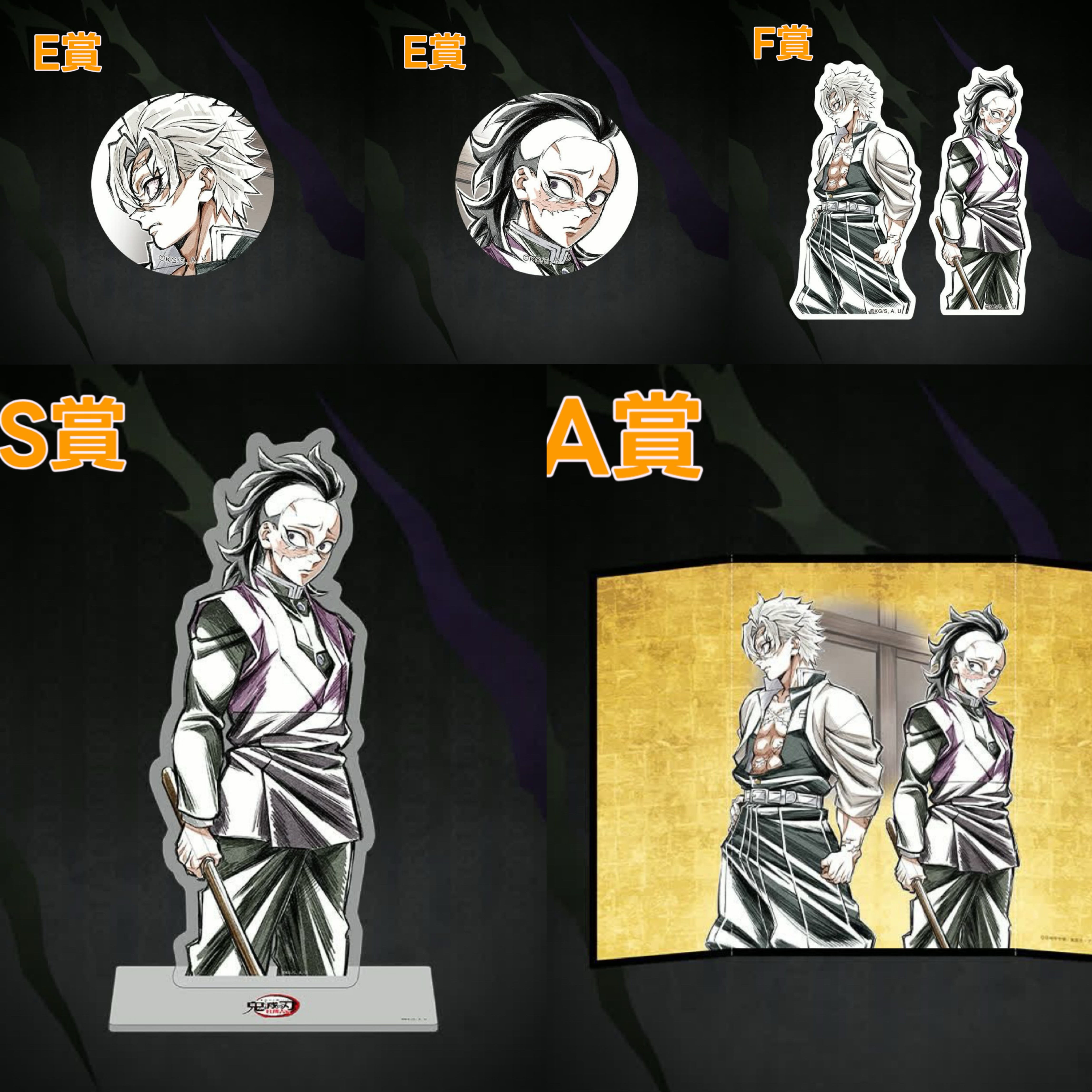 Kuji抽賞系列商品不包郵。 日本官方發貨日期預計為2026年6月 日本發貨後約3星期到港 官方貨品有機會存有瑕疵,不設退貨 S賞不死川玄彌(弟弟)大立牌:W96 × H241mm A賞金色屏風:W233mm × H213mm B賞玻璃水杯:Φ75mm × H81mm C賞燙金襟章:57mm D賞亞克力小立牌:W133 × H120mm E賞普通襟章:44mm F賞貼紙:約W50mm × H50mm