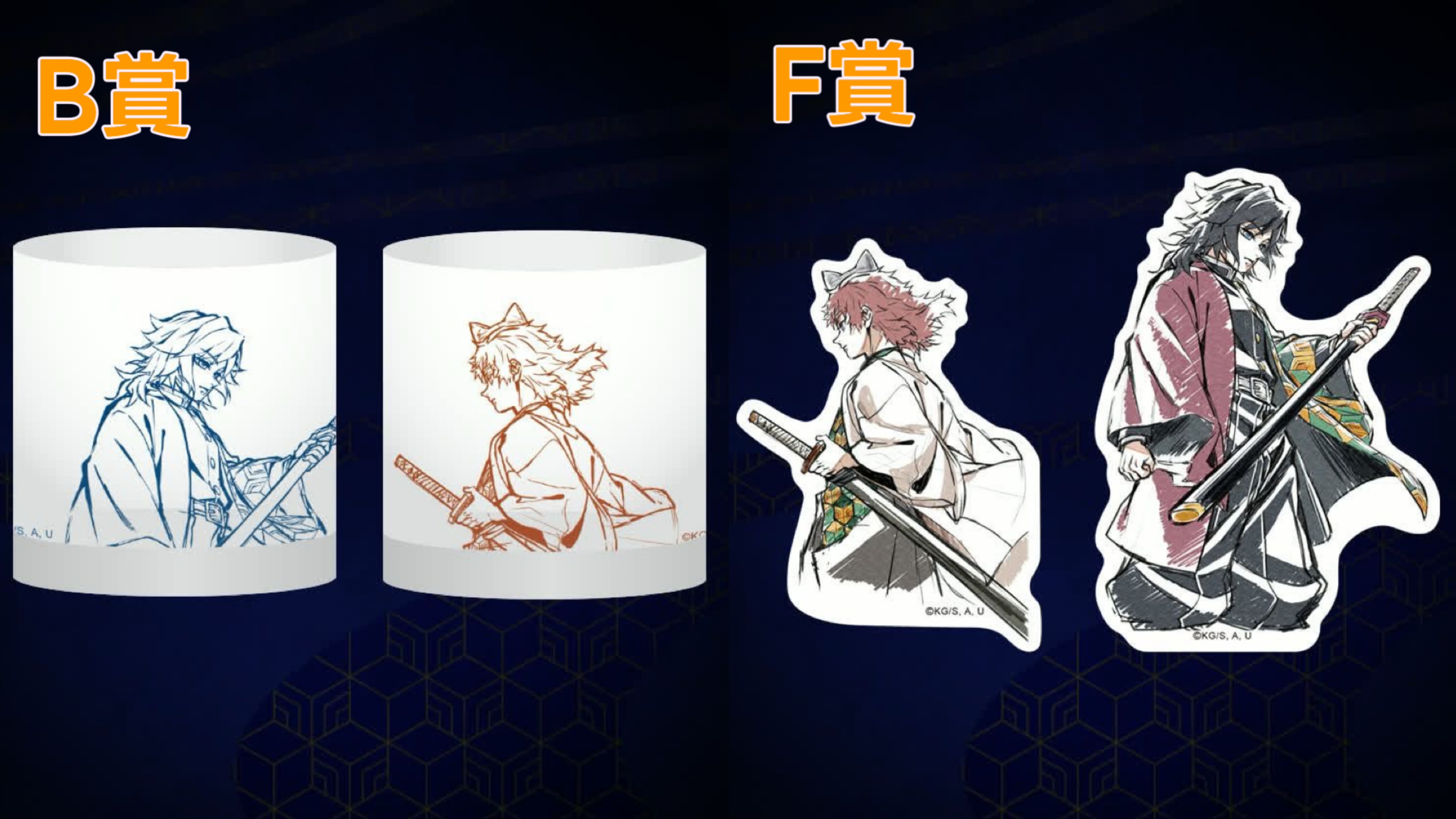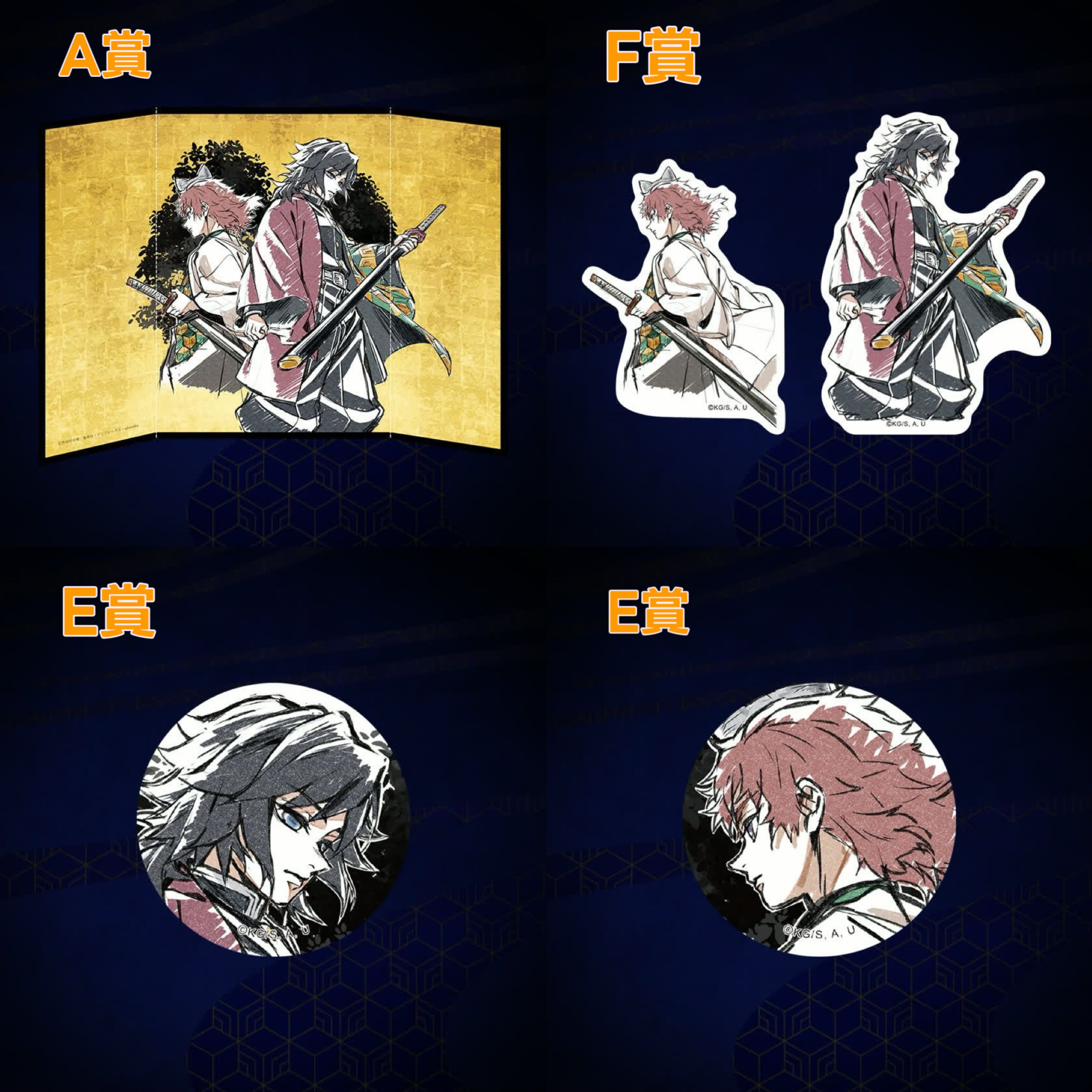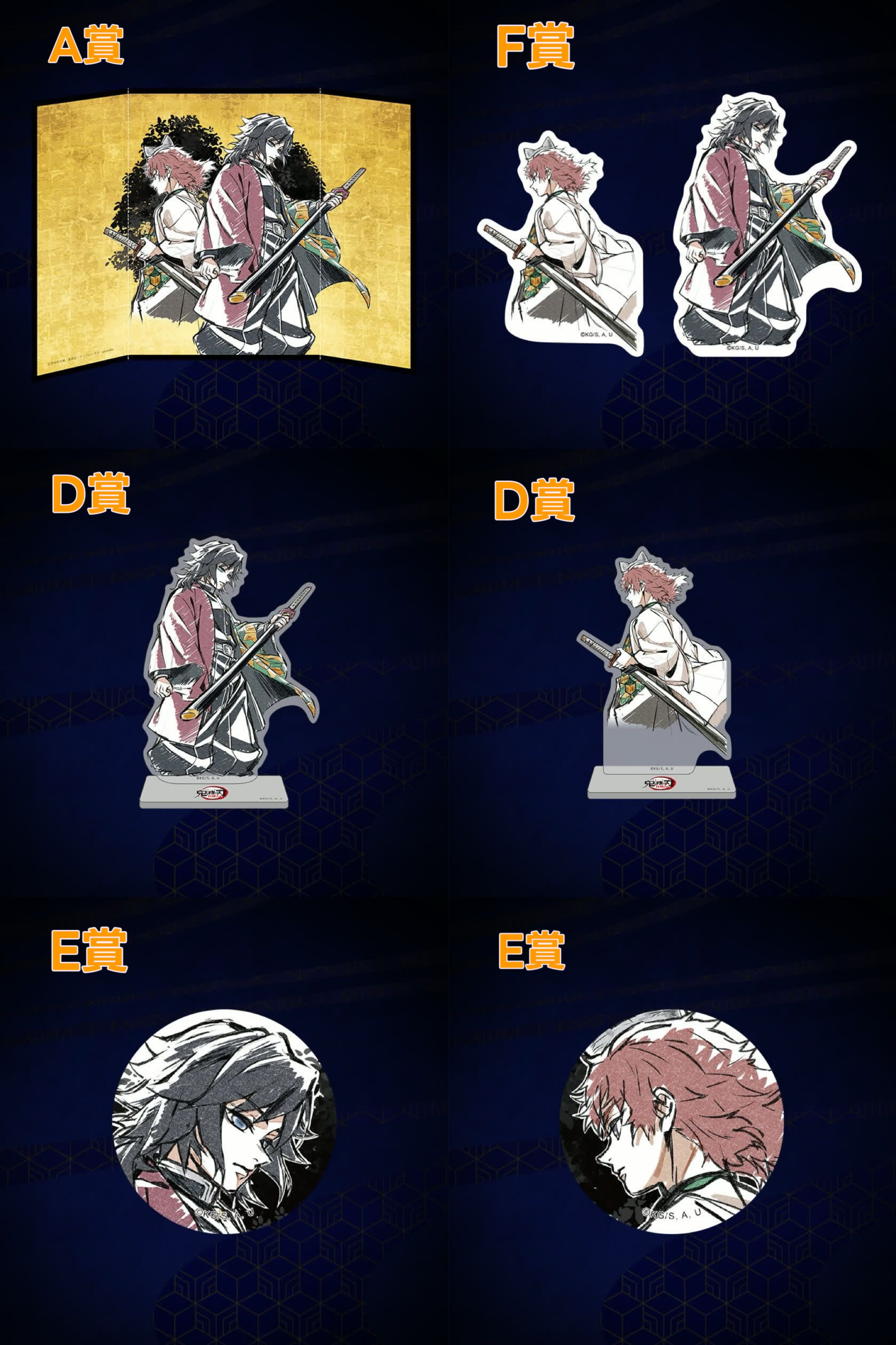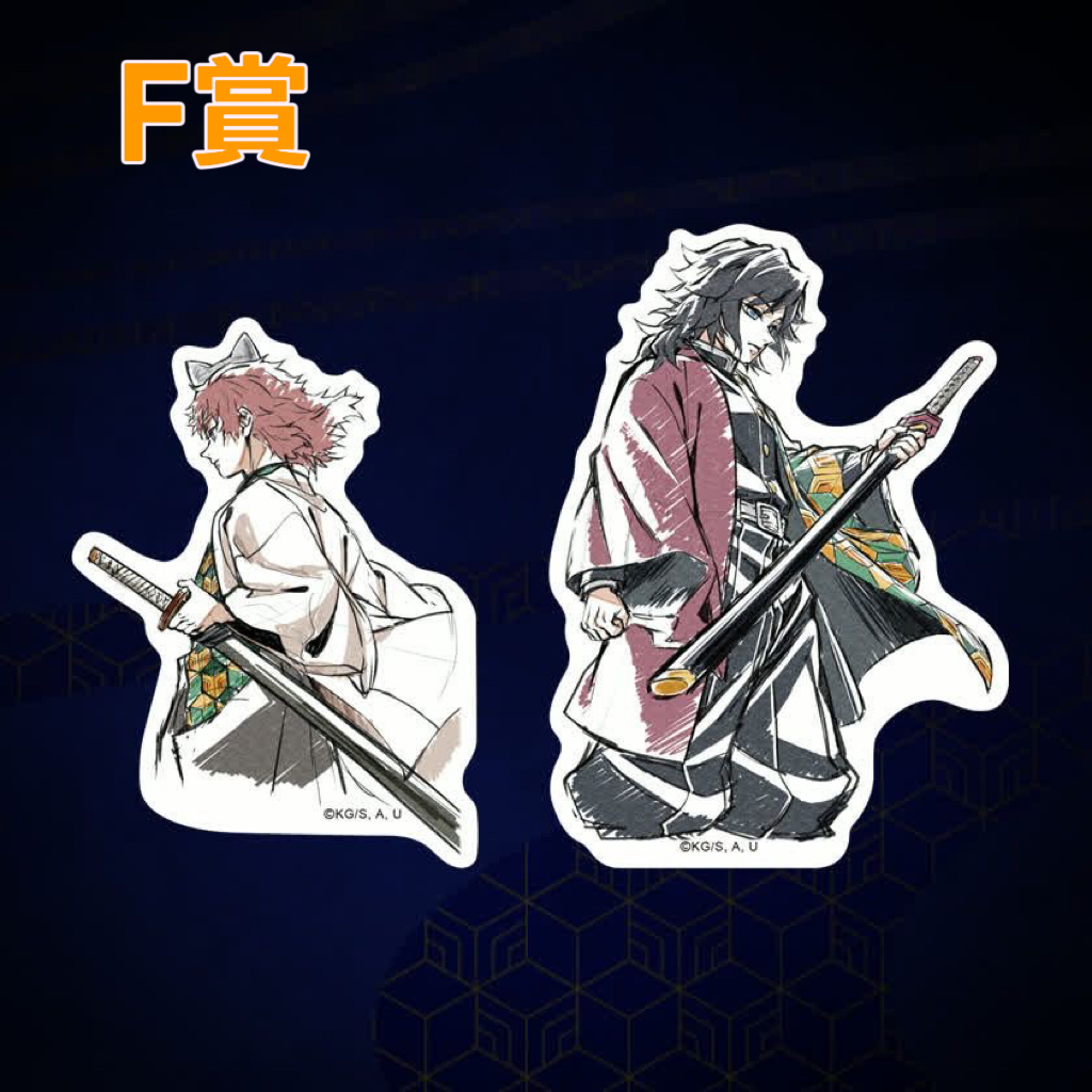 A賞金色屏風+D賞小立牌一對(義勇及錆兔)+E賞襟章一對(義勇及錆兔)+F賞貼紙