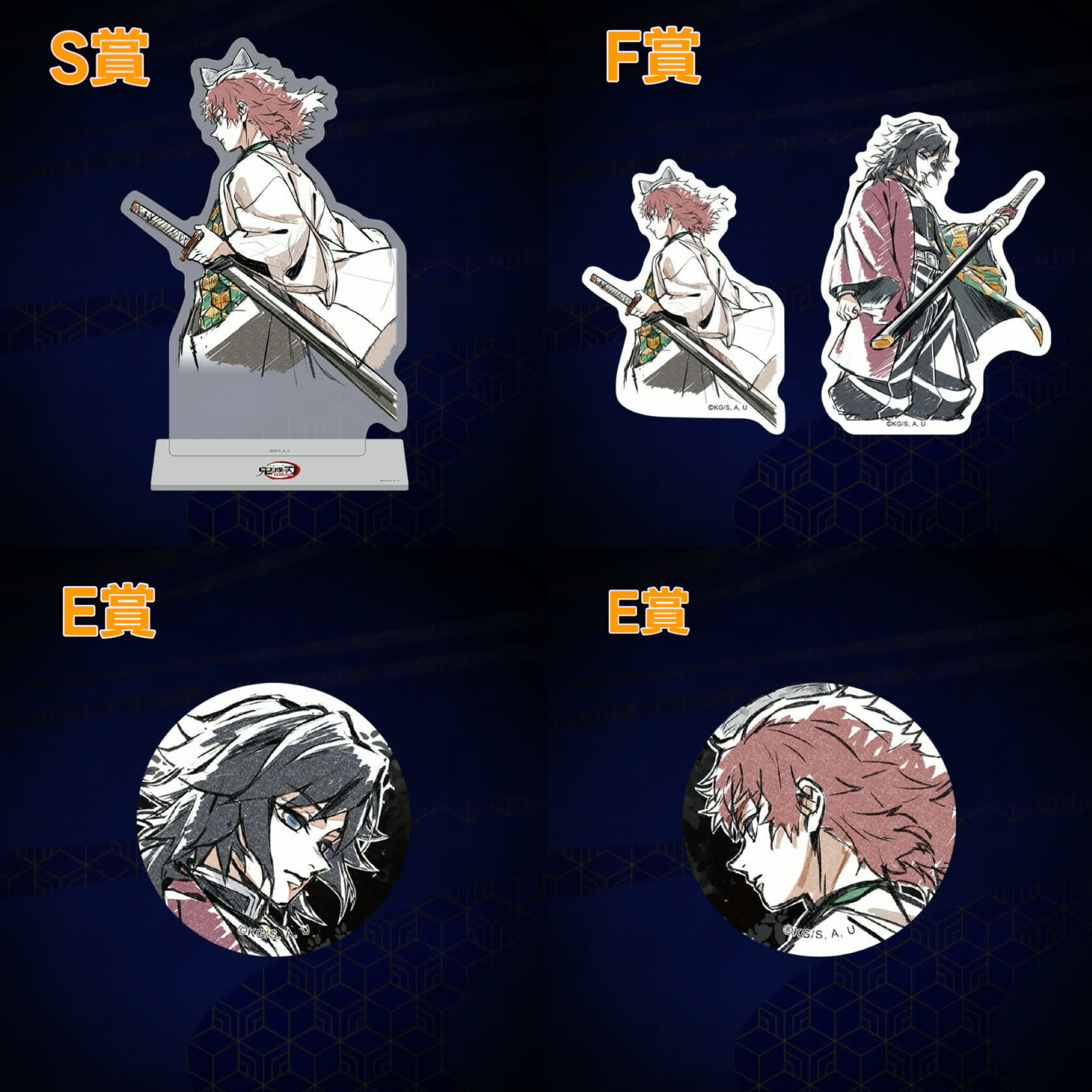 S賞亞克力大立牌 (錆兔)+E賞襟章一對 (義勇及錆兔)+F賞貼紙